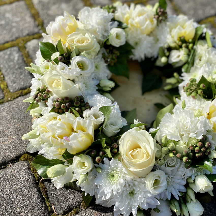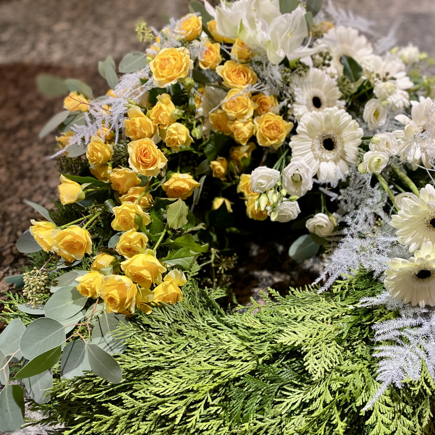Bei dem Trauerschmuck stehen wir Ihnen einfühlsam und unterstützend mit all unserer Erfahrung zur Seite. Kranz, Sargaufleger, Urnenkrone, Bukett, Trauerstrauß oder auch eine Pflanzschale – wir beraten Sie gern, ebenso bei einer großen Vielfalt an Schleifenfarben und Texten.